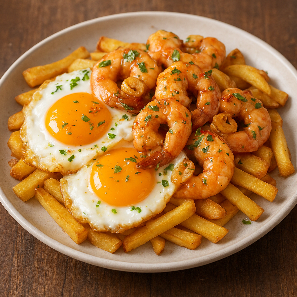 Huevos rotos con langostinos al ajillo.