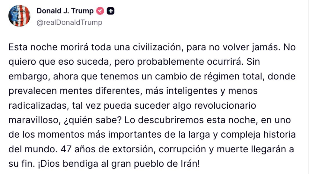 En redes sociales, la publicación de Trump generó miles de reacciones. Usuarios como @laderechadiario destacaron la frase “Esta noche morirá toda una civilización”, mientras otros, como @ghoragh, interpretaron que equivale a enviar a Irán “de vuelta a la Edad de Piedra” al destruir su generación eléctrica y transporte.
