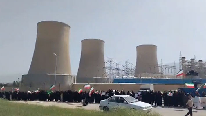 Jóvenes y estudiantes iraníes reunidos en cadena humana frente a una planta de energía con banderas nacionales. Fuente: NTN24 / Iranian state television, 7 de abril de 2026