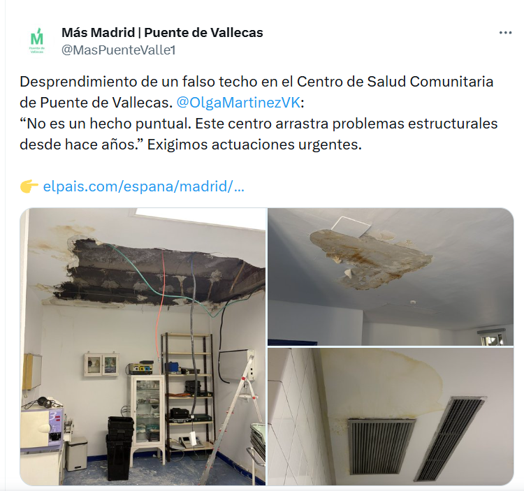 En la red social X, y en facebook, han querido mostrar las fotos del techo derrumbado y el deterioro de las estancias del centro de Salud.